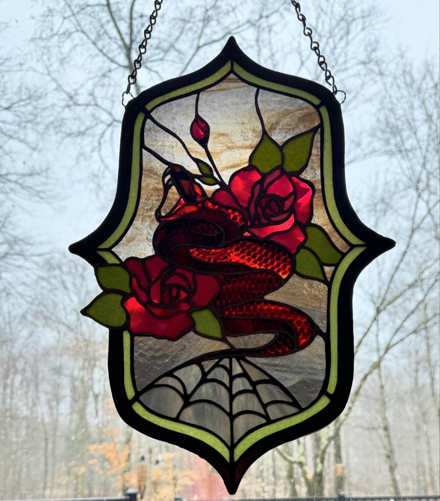 if hanging in a window - use a screw-in ‘cup’ hook, nail, or anchored screw to hang your piece. I recommend staying away from using plastic, or rubber suction hooks as they tend to come unstuck randomly and it would be so sad if your stained glass fell and broke, however if this is your only option make sure you check the suction often and keep the base that attatches to the window clean.