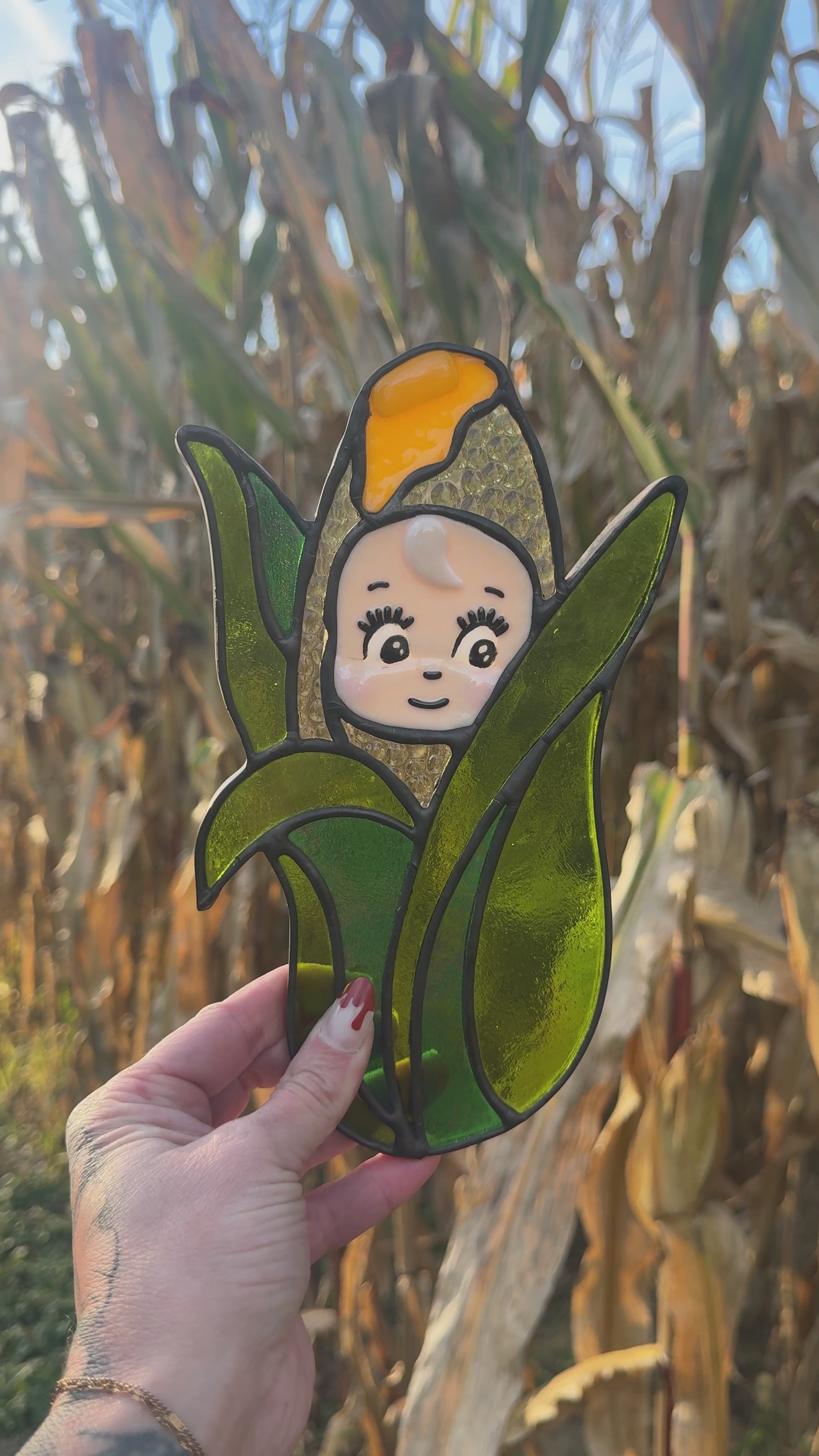 Each corn Kewpie baby features a custom fused glass face, and little melted butter topper. This piece features Iridescent and textured glass from Wissmach, and has been properly taken out for a country Ohio day for photos before being shipped off to their new home. Lol.